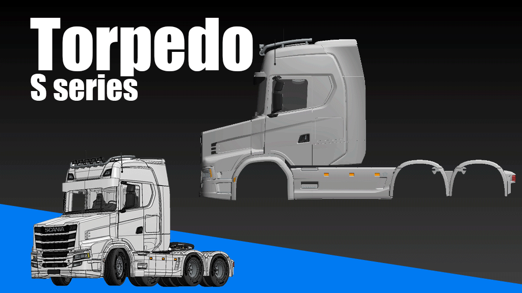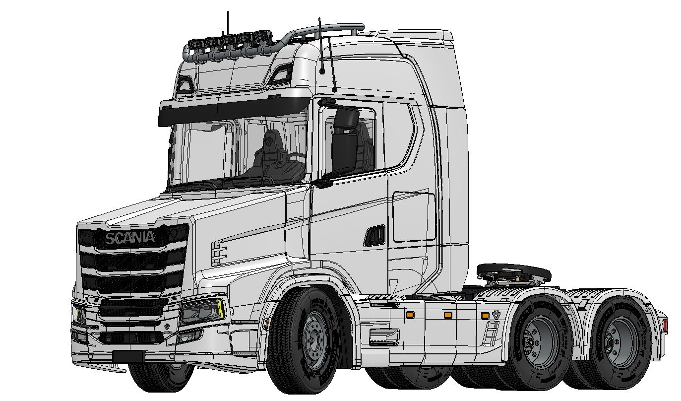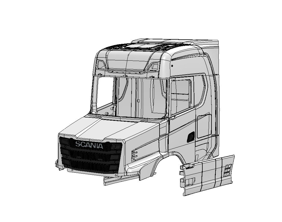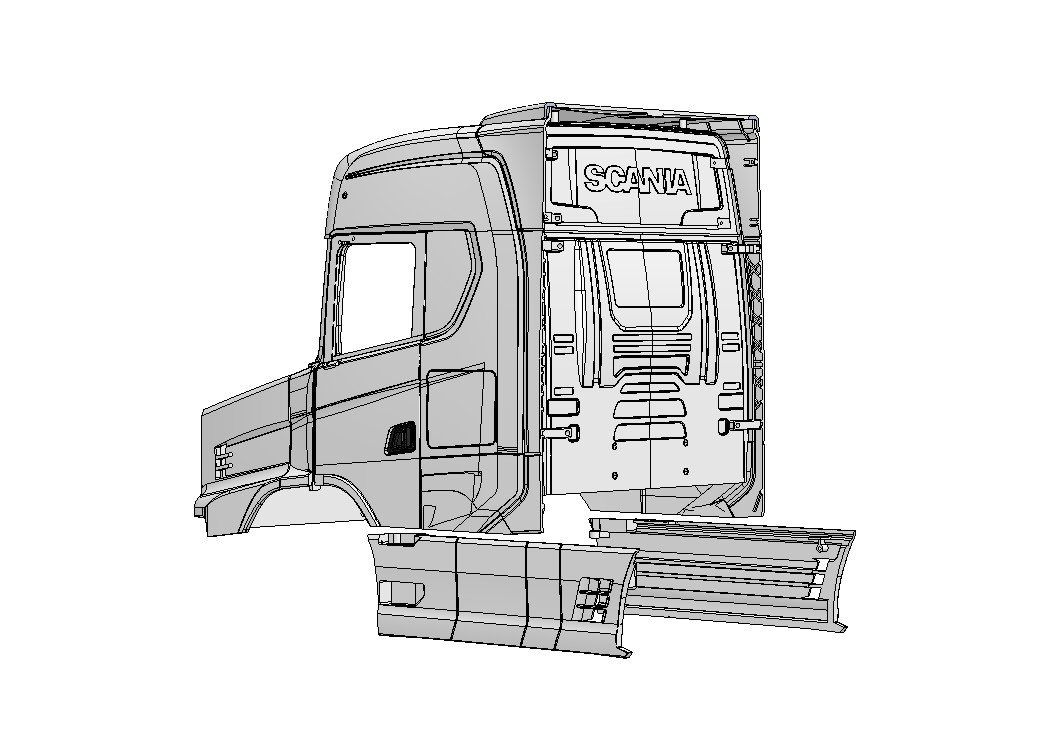 Converts 1:14 scale Tamiya Scania S770 into a Scania T Series Torpedo – Extended Cabin version